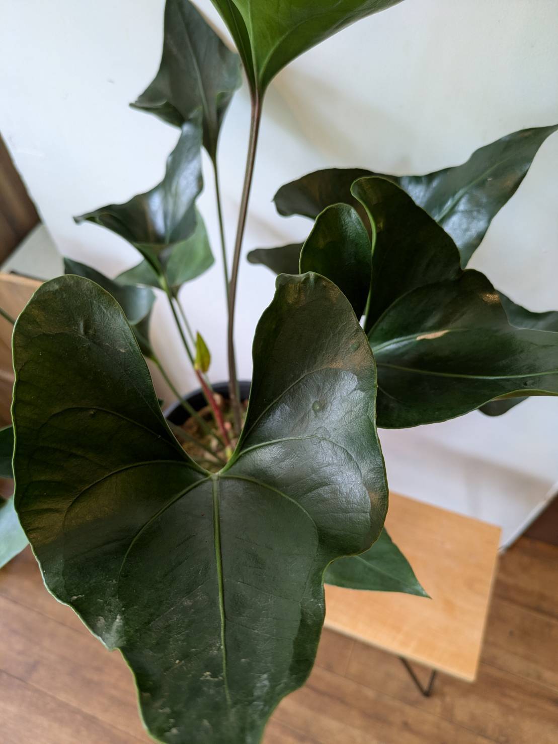 苞は品種によっても異なる花色があり、赤、白、ピンク、紫など、また形もハート状や卵型など様々ですが、アローは花はあまり咲かせない品種で(咲いても小さく目立ちません)槍のように上向きに伸びたダークグリーンの葉姿を楽しむ、原種のアンスリウムです。