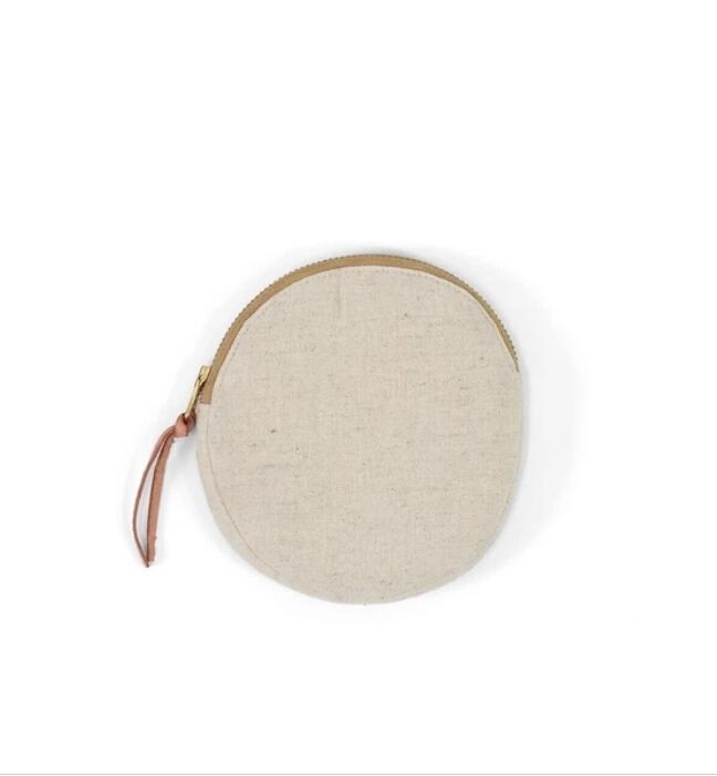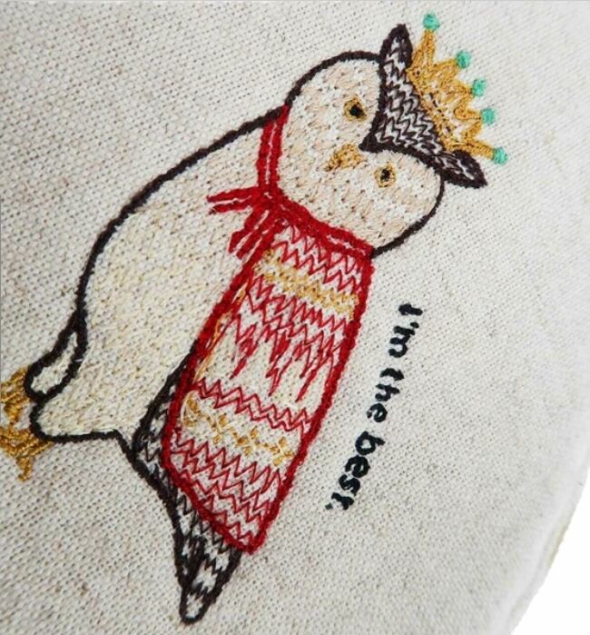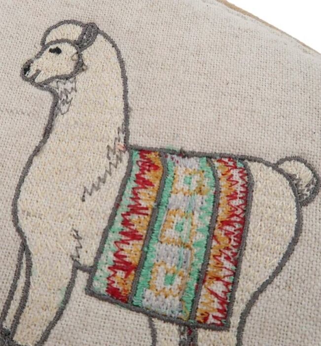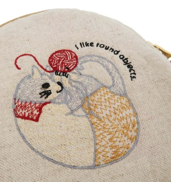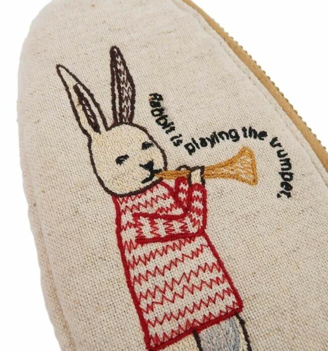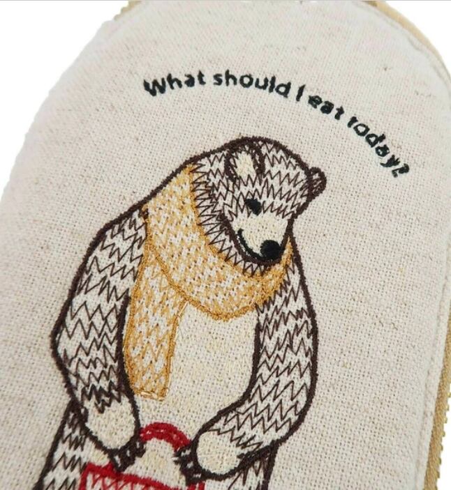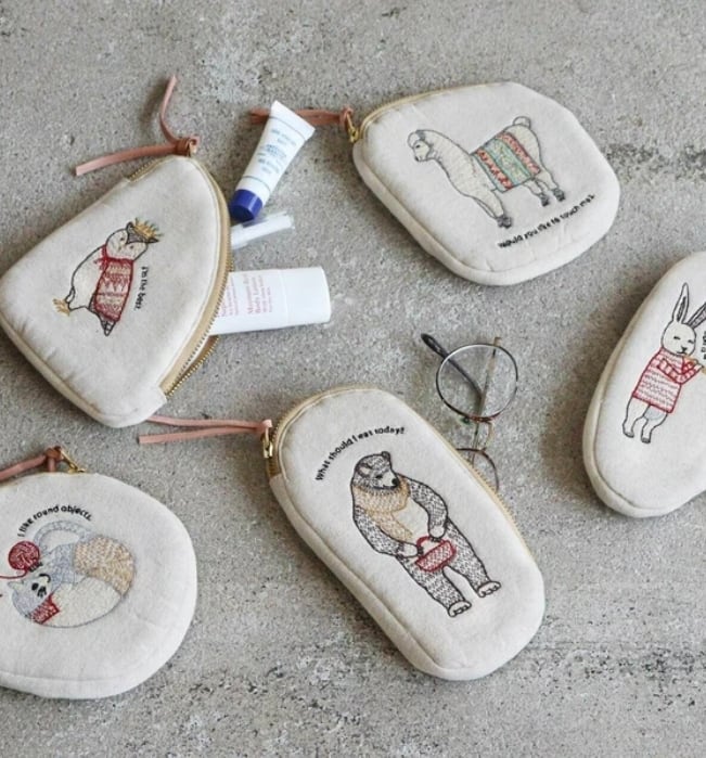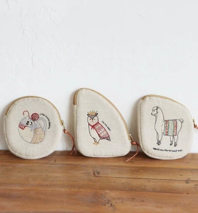 ユニークな動物の刺繍を施したコットンリネンポーチ。