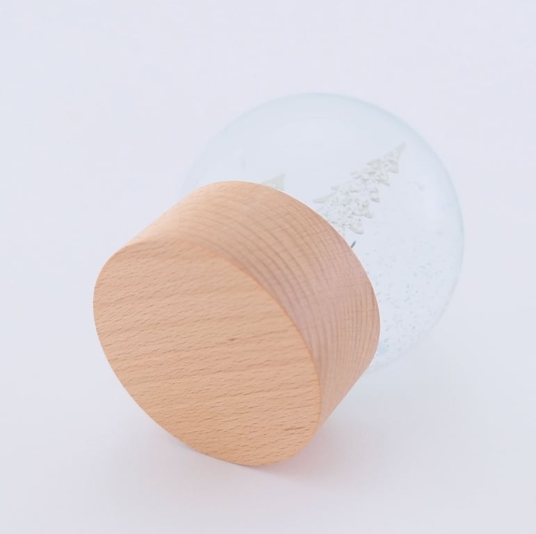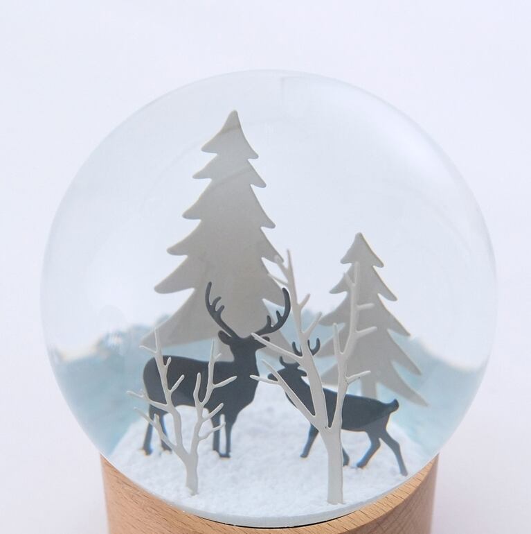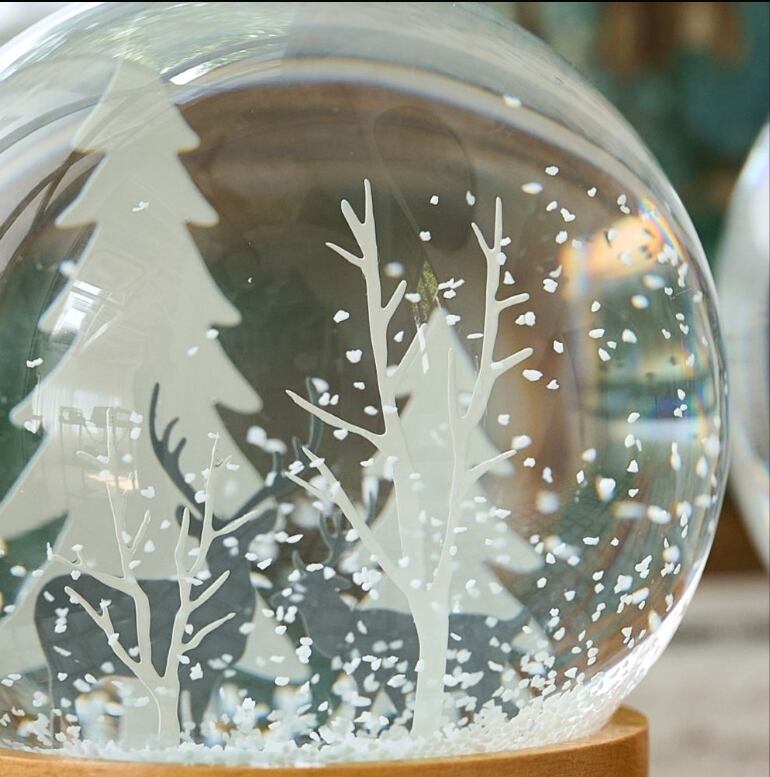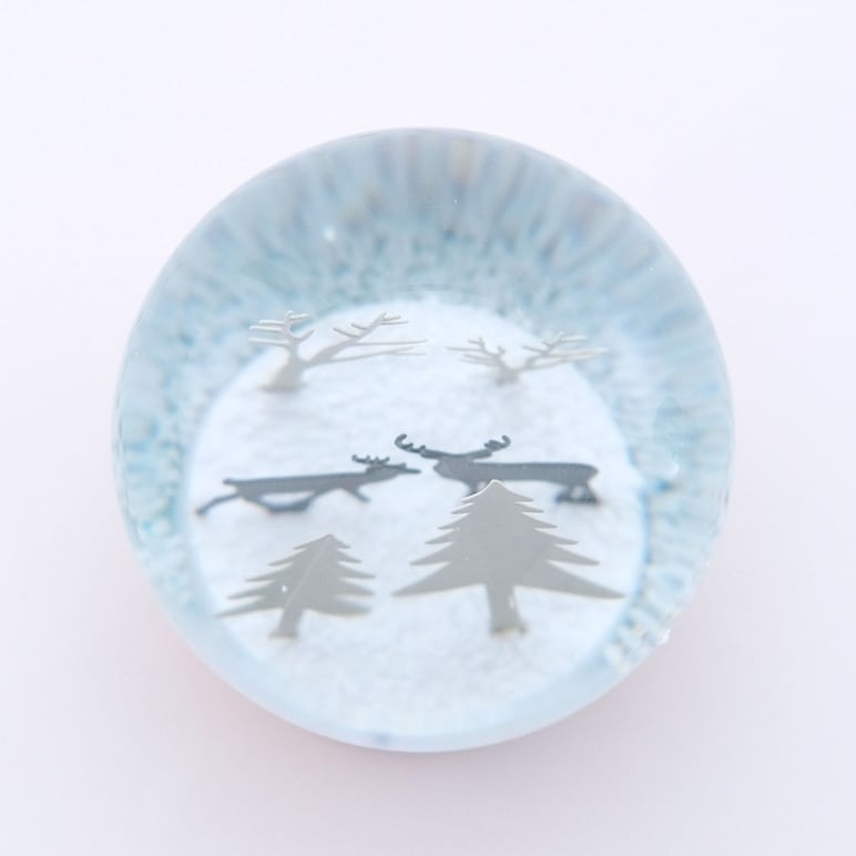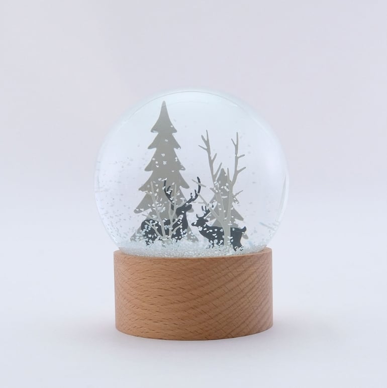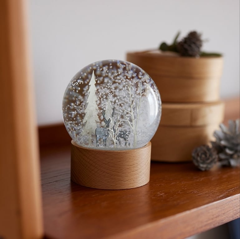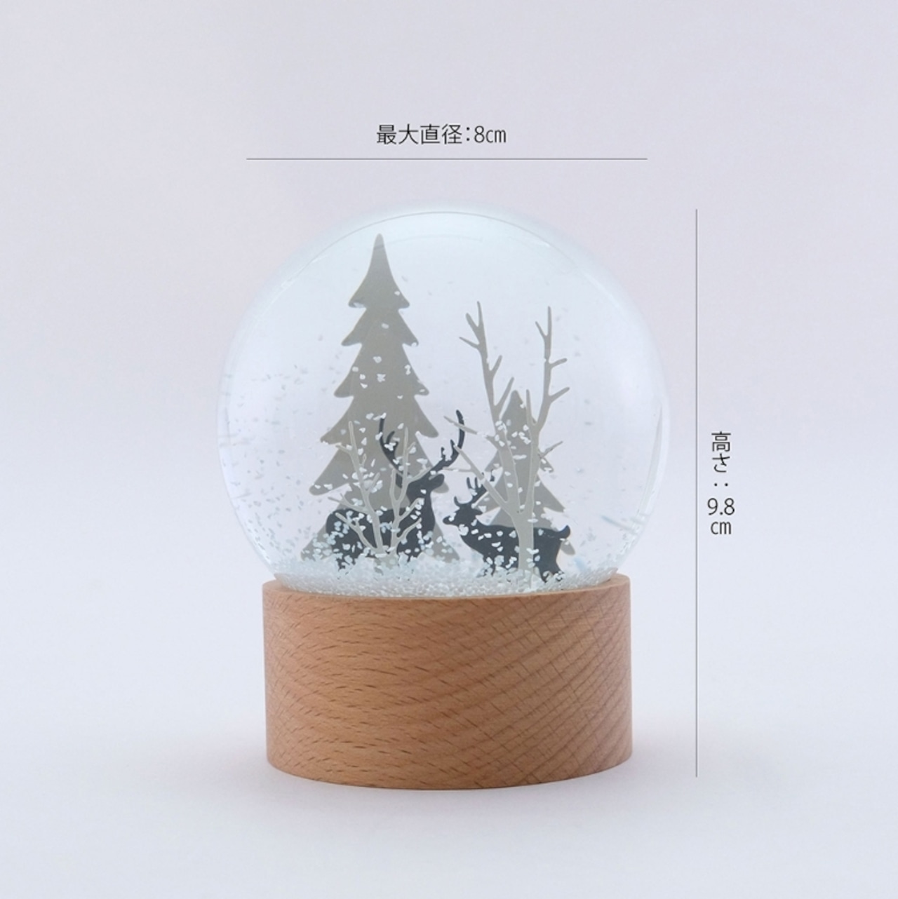 真っ白な雪でおおわれた幻想的な森の中をイメージしたスノードーム。