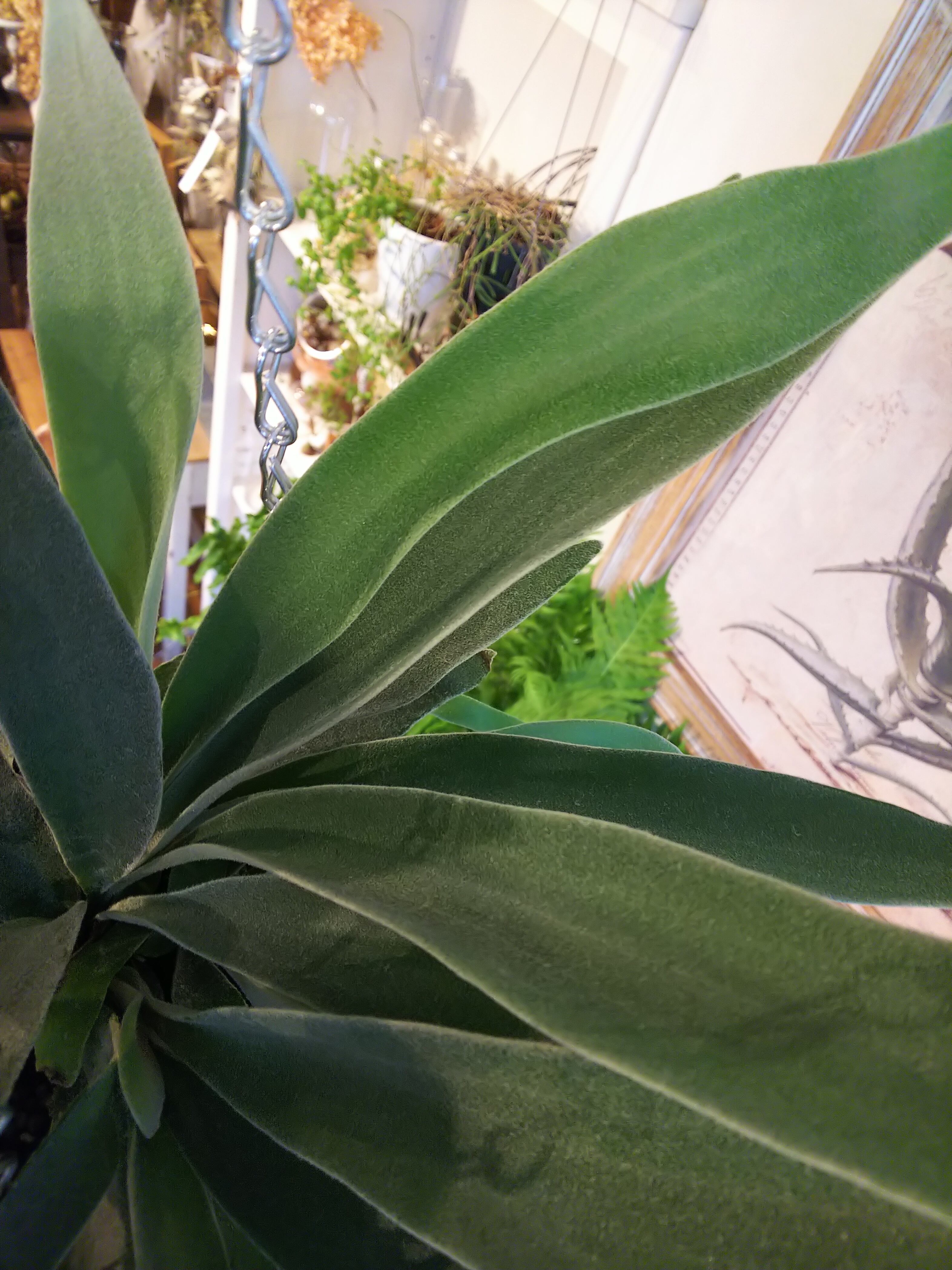 ビーチーは通常のコウモリランよりも葉が細く深い切れ込みがあり、シルバーリーフが特徴です。葉の表裏には星状毛があり、これが白い葉の秘密です。