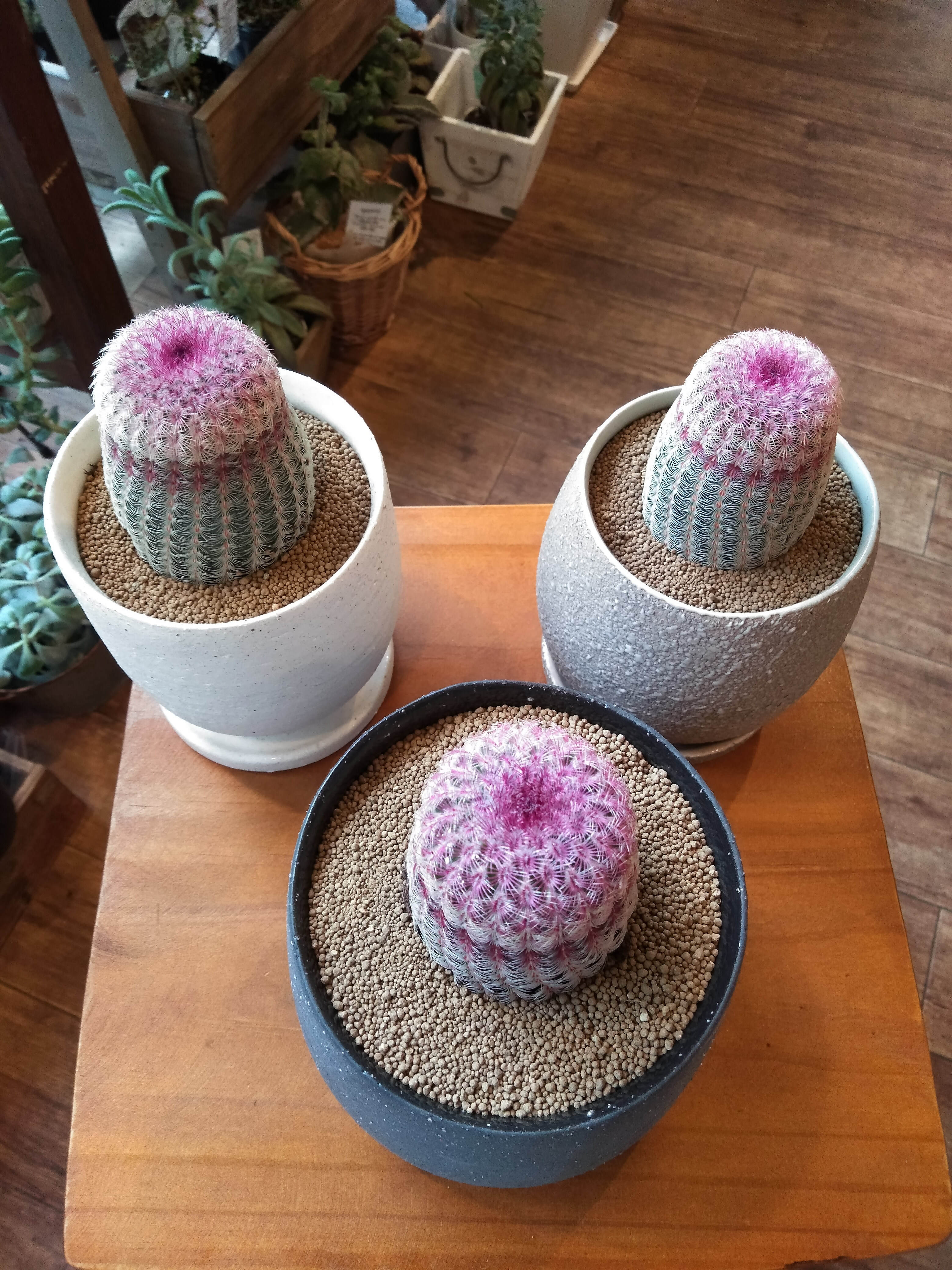へりさし(縁刺)という円柱状に生えた赤ピンク(赤紫)のトゲに覆われたグラデーションの美しいサボテン。