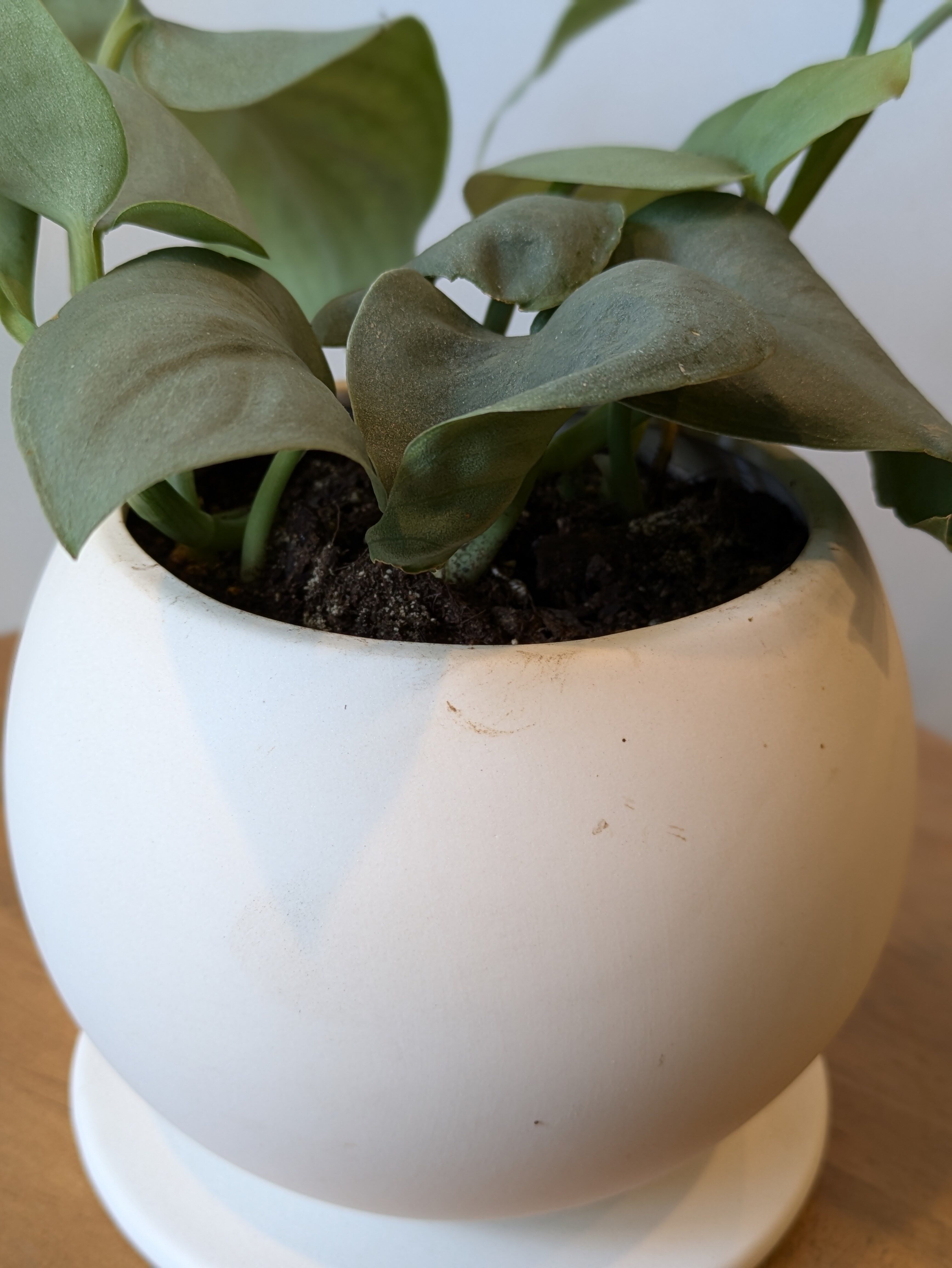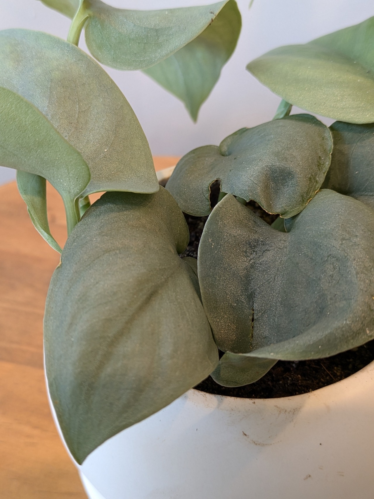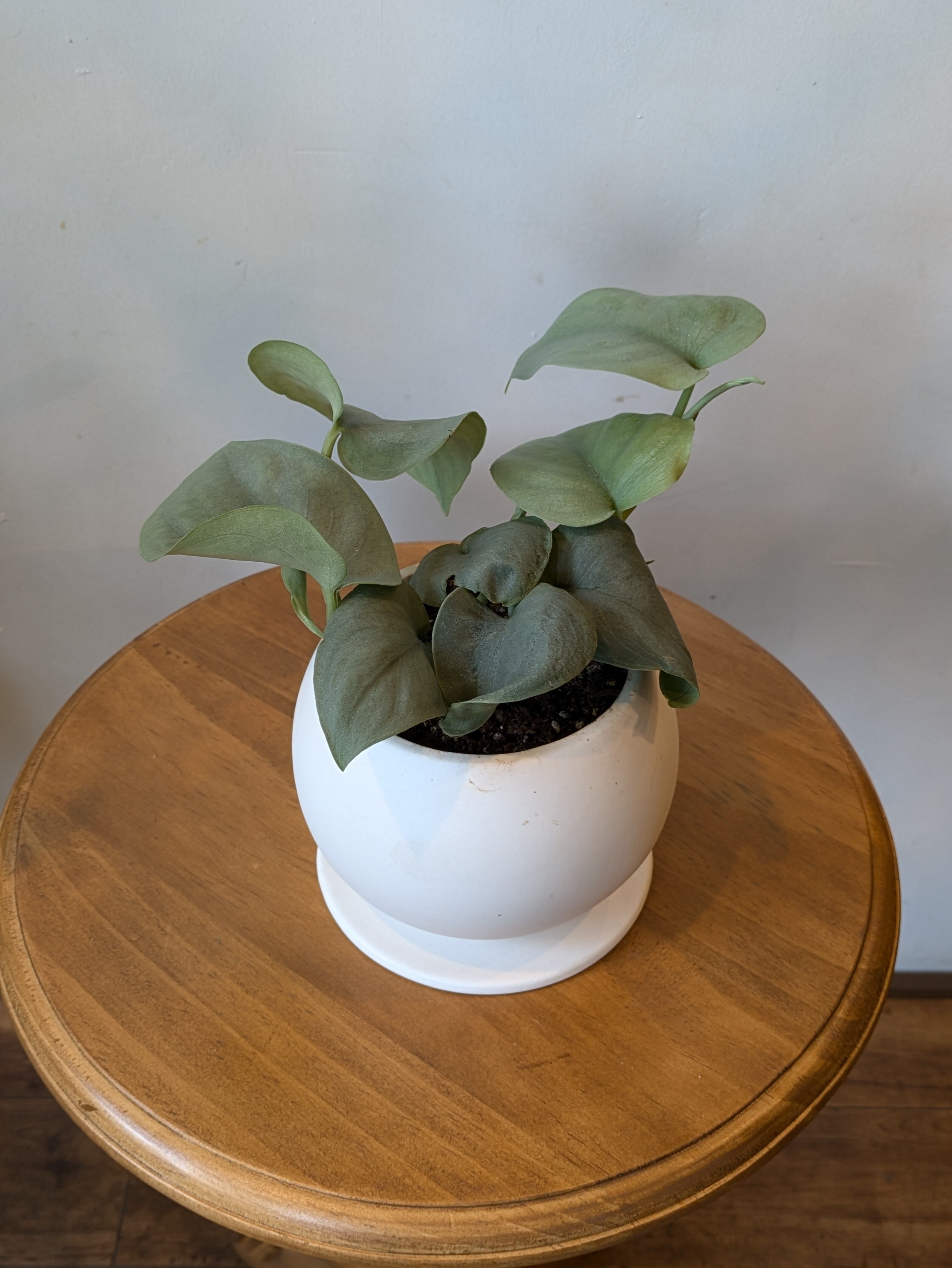 シラフカズラとも呼ばれるつる性の植物で、厚みのある葉にシルバーグリーンの斑が入っています。