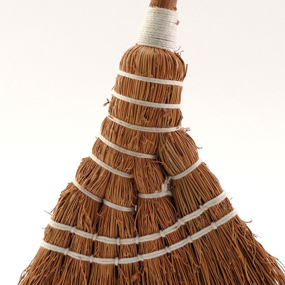 モロコシと呼ばれるイネ科の一年草のことで、穂先がしなやかでわずかに油分を含むのが特徴です。中でも穂の部分が長く揃っているモロコシは、昔から座敷箒(ざしきほうき)の原料として使われてきました。モロコシで作られたホウキで畳の上を掃くと畳につやを与えることができ、とても合理的な掃除道具として日本人には馴染み深いアイテムです。洋間が主流となった現代でのホウキは、電気を使わないエコやサスティナビリティーの観点から、さらには心身を整えるためのマインドフルネスや禅の観点からも再注目されています。ひとつひとつ職人の手で編み上げられたソルガムホウキは、軽量で実用性も備えつつ、シンプルで洗練されたルックスに仕上げました。普段使いにサッと使えて便利なのはもちろん、仕舞わずにインテリアの一部としてもお楽しみいただけます。
