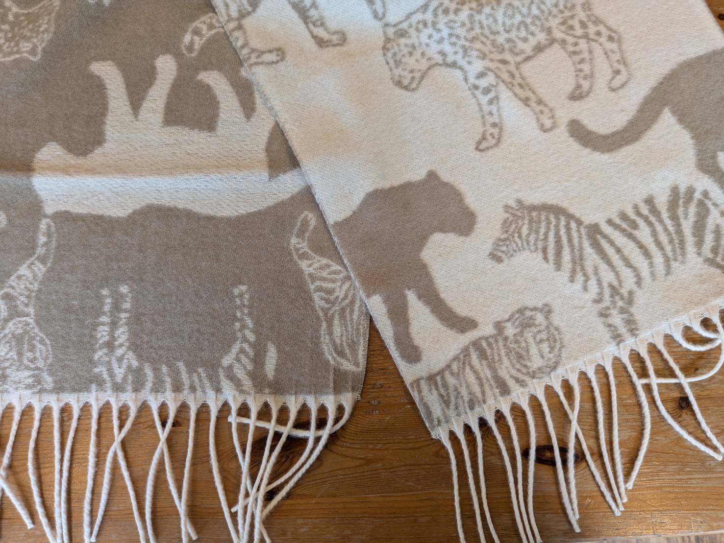 柔らかな肌触りと軽さが魅力のアイテムです。しっかりとした素材感ながら、首元を心地よく包み込んでくれるので、寒い季節のお出かけにぴったり。柄にはシマウマやヒョウ、トラが描かれています。カジュアルでもフォーマルでもお使いいただけるデザインで、コーディネートの幅が広がります。
